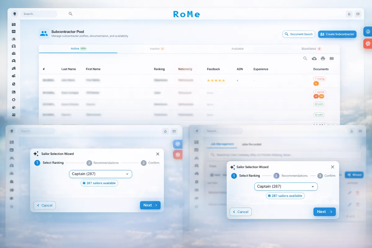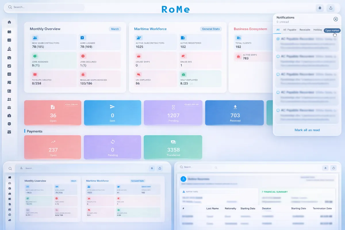 An enterprise platform purpose-built for maritime staffing companies and ship management firms. It brings crew recruitment, job assignments, invoicing, payroll, and accounting into a single system — replacing scattered spreadsheets and disconnected tools with a unified workflow that scales with your operation.